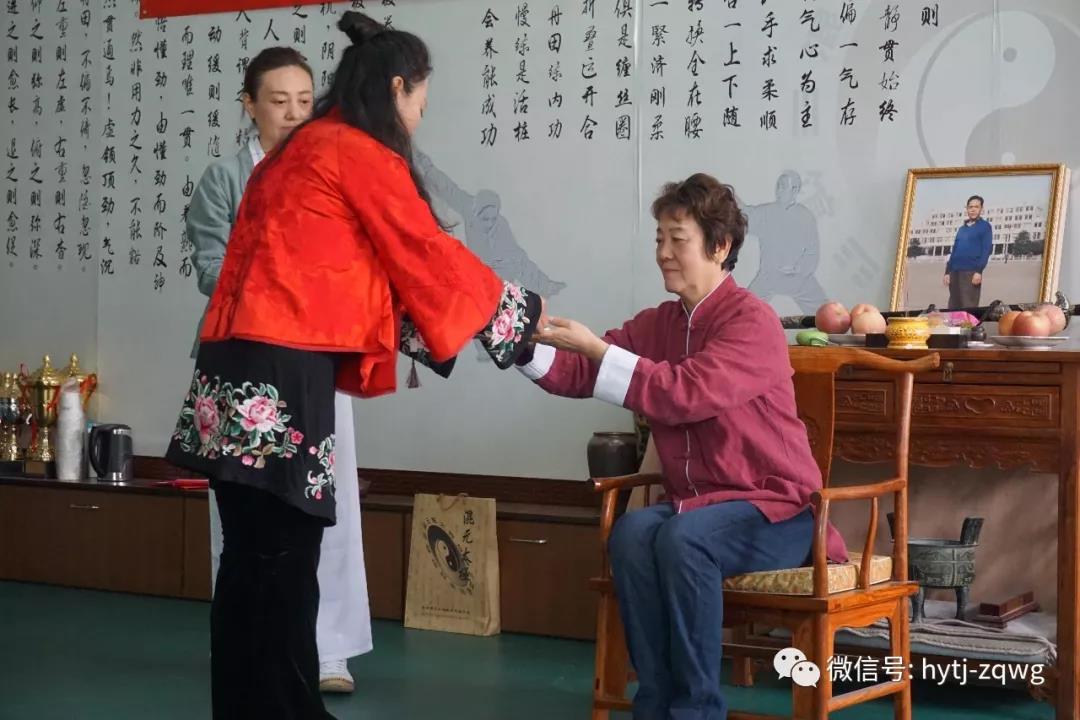 仪式进入到下一个环节,由新近入门弟子宣读拜师贴和混元太极门规。随后他们分别向他们的恩师冯秀芳老师行跪拜礼,递拜师帖并献茶。而后冯老师也一一对弟子进行了嘱托并回赠礼品。